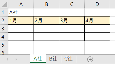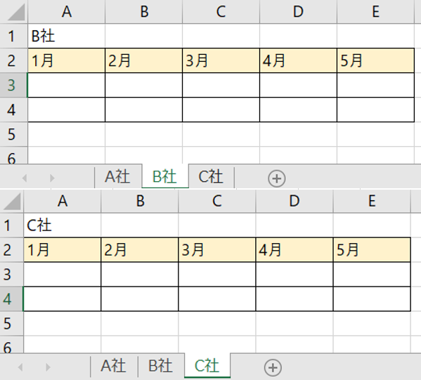 例えば、以下のように「A社」「B社」「C社」のシートが2つあり、