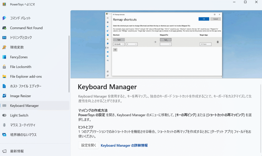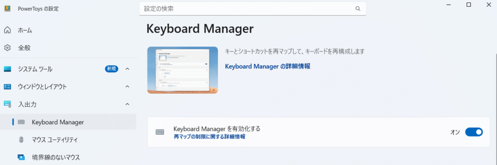 - 左メニューから 「Keyboard Manager(キーボードマネージャー)」 を選択