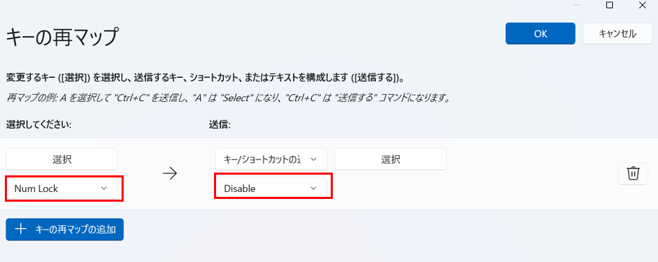 - 画面下の「+キーの再マップの追加」ボタンをクリックして、新しい設定を追加