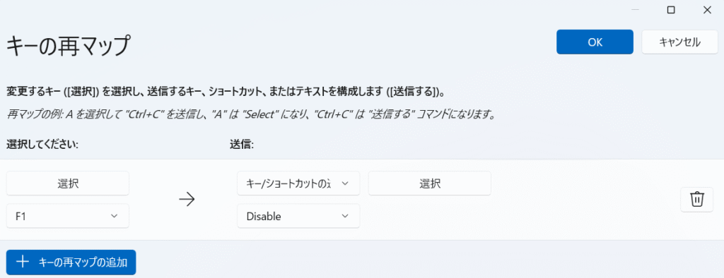 • 左側(変更するキー)に F1 を選択、右側(新しい動作)に Disable(無効化) を選択